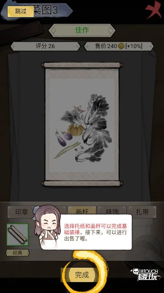 2、个性装裱系统:每幅画完成后都要好好装裱。印章题跋、画杆托纸,甚至小到挂饰扎带等每个类别都有多种个性选项,可根据自身风格diy装裱,提升画作品质,从而售卖出更理想的价格。